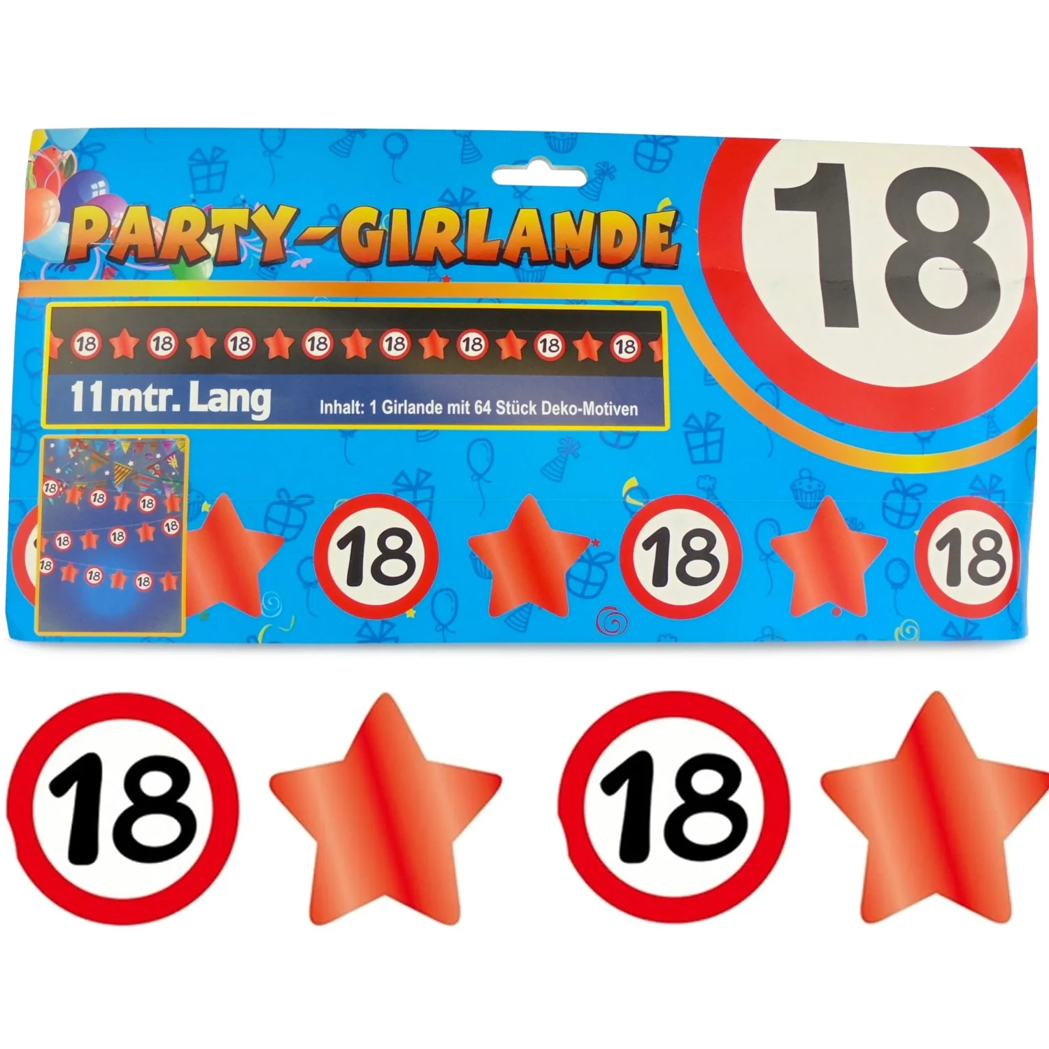 Diese Girlande zieht sofort alle Blicke auf sich, weil sie ein fröhliches und zugleich klares Design kombiniert. Die roten Sterne sorgen für Dynamik, während die klassischen Verkehrsschilder mit der „18“ den Anlass deutlich hervorheben. Dadurch entsteht ein harmonisches Gesamtbild, das sowohl modern als auch verspielt wirkt. Und genau diese Mischung macht Ihre Dekoration besonders.