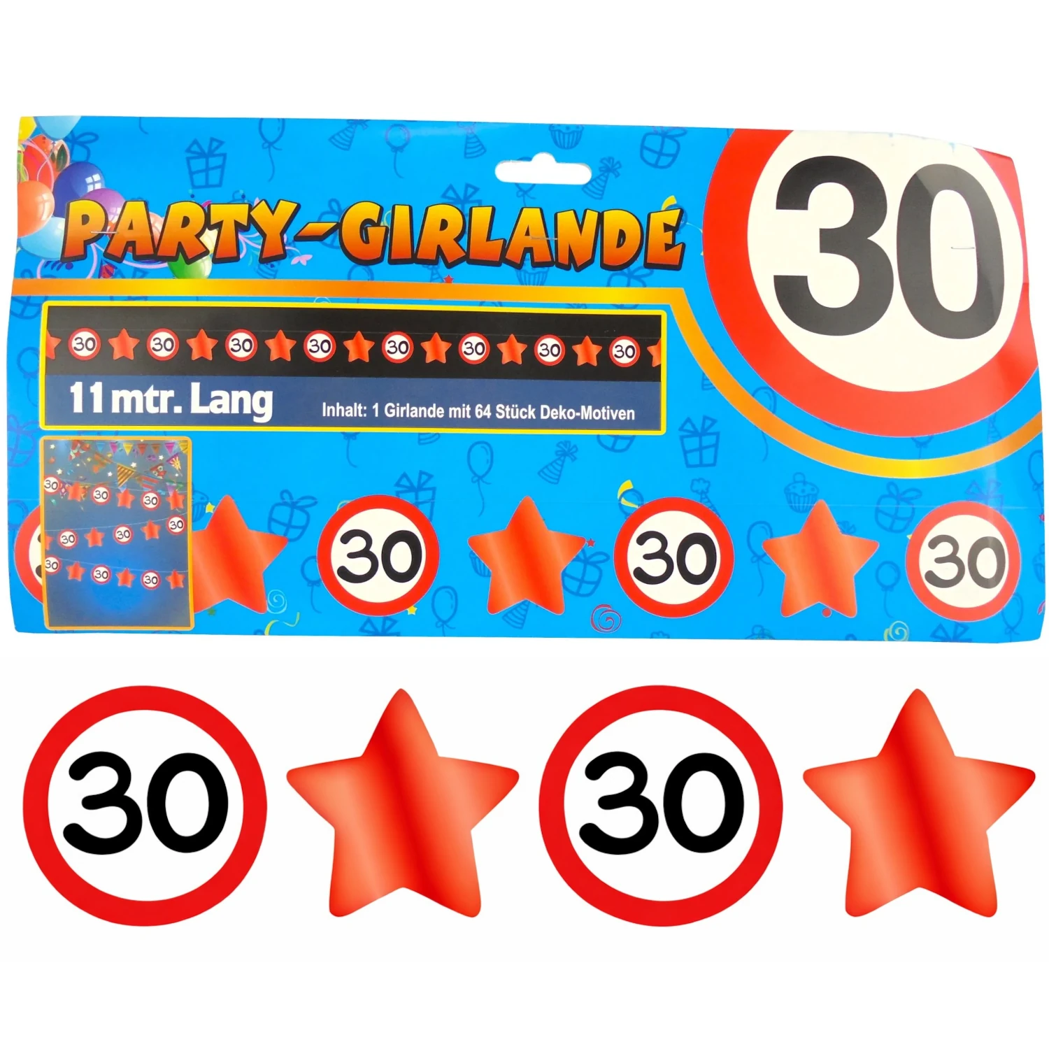 Diese Girlande sorgt sofort für Aufmerksamkeit, weil sie klare Formen und kräftige Farben kombiniert. Die klassischen Verkehrsschilder mit der „30“ stehen im Mittelpunkt und machen den Anlass auf einen Blick erkennbar. Gleichzeitig lockern die roten Sterne das Gesamtbild auf, sodass eine fröhliche und lebendige Stimmung entsteht. Dadurch wirkt Ihre Dekoration nicht nur modern, sondern auch einladend.