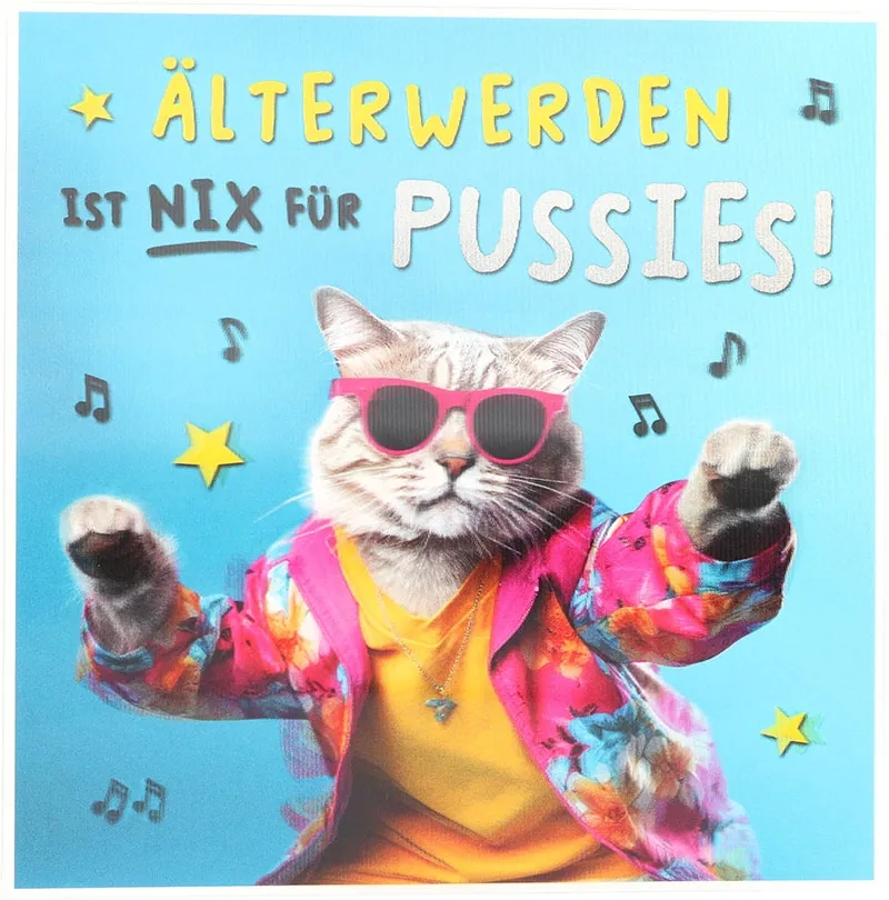 Die 3D Musikkarte “Älterwerden ist nix für Pussies!” ist ideal für Menschen mit Humor. Für Freunde, die das Leben feiern. Und für alle, die keine langweiligen Glückwünsche mögen. Sie ist laut. Sie ist bunt. Und sie bleibt im Kopf. Genau so, wie ein Geburtstag sein sollte.
