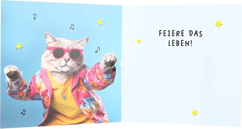 Im Inneren bleibt es positiv und motivierend. „Feiere das Leben!“ bringt die Botschaft einfach und stark auf den Punkt. Gleichzeitig haben Sie genug Platz für Ihre eigenen Worte. So gestalten Sie Ihren Gruß individuell. Kurz. Persönlich. Und genau passend zum Anlass.
