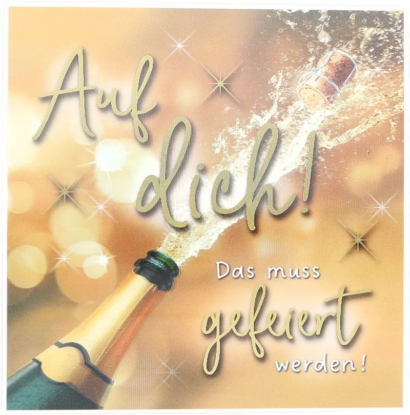Manchmal braucht es mehr als nur Worte. Genau dann begeistert Sie die 3D Musikkarte “Auf dich! Das muss gefeiert werden!”. Sie verbindet Emotion, Überraschung und Stil – und schafft sofort eine festliche Stimmung. Schon beim ersten Blick zieht das edle Design in warmen Goldtönen alle Aufmerksamkeit auf sich. Der spritzige Champagner, der scheinbar lebendig aus der Flasche schießt, steht sinnbildlich für Freude, Erfolg und unvergessliche Augenblicke.