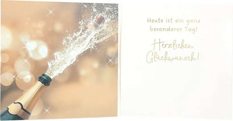 Innen erwartet Sie eine stilvolle Fortsetzung des Designs. Links setzt sich das prickelnde Champagner-Motiv fort, während rechts eine liebevolle Botschaft steht: „Heute ist ein ganz besonderer Tag! Herzlichen Glückwunsch!“ So haben Sie zusätzlich Platz für persönliche Worte – individuell, herzlich und passend zum Anlass.