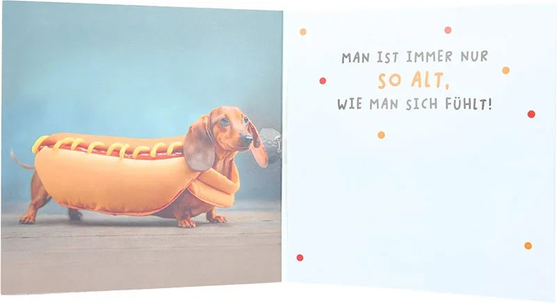 Im Inneren setzt sich das liebevolle Motiv fort, sodass ein stimmiges Gesamtbild entsteht. Auf der rechten Seite lesen Sie die Botschaft „Man ist immer nur so alt, wie man sich fühlt!“. Diese Worte wirken motivierend und gleichzeitig humorvoll, während sie dem Geburtstagskind ein gutes Gefühl geben. Gleichzeitig bleibt ausreichend Platz für Ihre eigenen Wünsche, sodass Sie Ihre Glückwünsche individuell gestalten können.