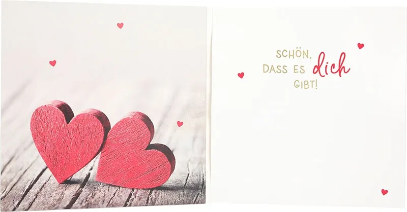 Im Inneren erwartet Sie ein stilvoll gestaltetes Layout mit der Botschaft „Schön, dass es dich gibt!“. Kleine Herzdetails sorgen für eine harmonische Ergänzung. Gleichzeitig haben Sie ausreichend Platz für Ihre persönlichen Worte. Und genau hier können Sie Ihre Gefühle ausdrücken – individuell, ehrlich und ganz nah am Empfänger.