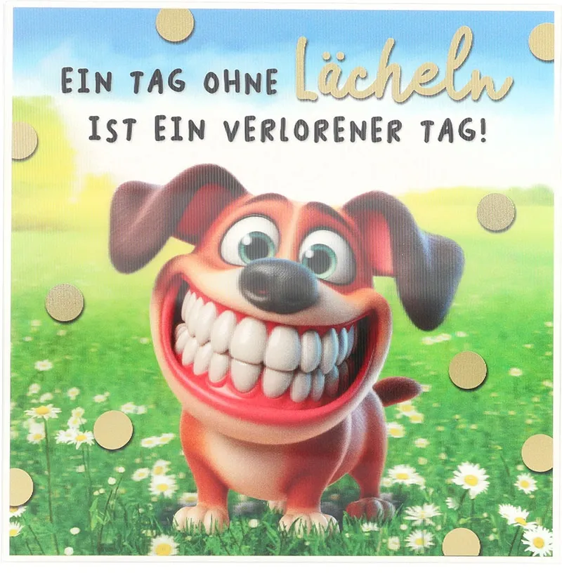 Bereits das Cover sorgt für gute Laune. Ein fröhlicher, charmant gezeichneter Hund steht mitten auf einer blühenden Wiese. Seine großen Augen strahlen. Und sein breites, fast übertriebenes Lächeln ist einfach ansteckend. Kleine goldene Punkte und helle Farben verstärken die positive Stimmung zusätzlich. Der Spruch „Ein Tag ohne Lächeln ist ein verlorener Tag!“ bringt die Botschaft klar und direkt auf den Punkt. Er ist motivierend. Er ist herzlich. Und er passt zu vielen Anlässen.