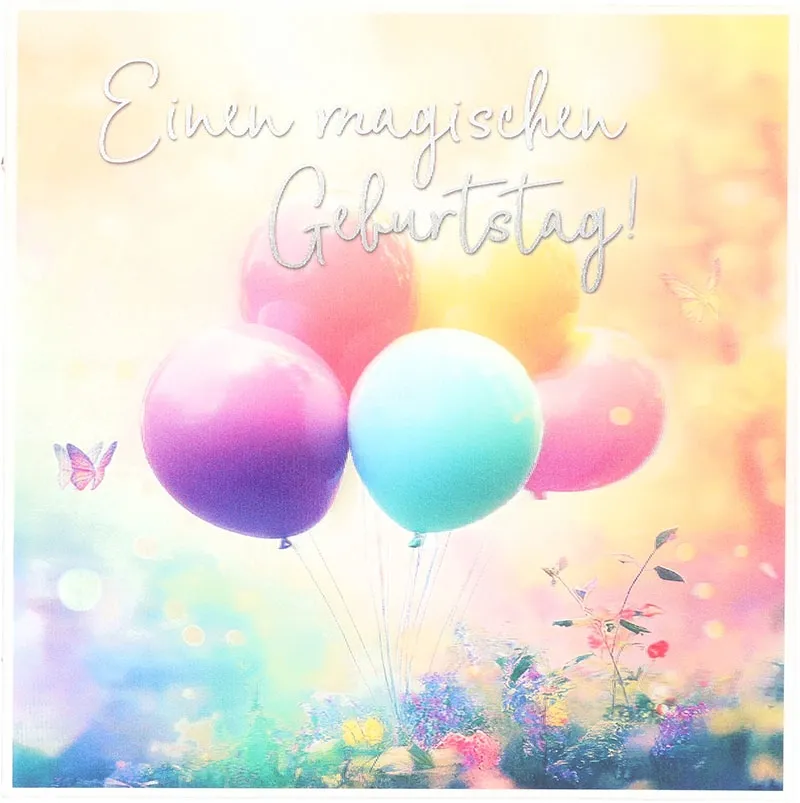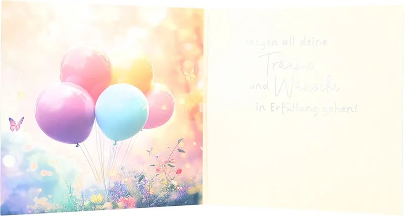 Schon das Cover begeistert, weil zarte Farben und sanfte Lichtreflexe eine märchenhafte Stimmung erzeugen. Gleichzeitig schweben bunte Ballons scheinbar schwerelos durch eine blühende, verträumte Landschaft. Dadurch entsteht ein harmonisches Gesamtbild, während kleine Schmetterlinge zusätzliche Leichtigkeit verleihen. So wirkt die Karte verspielt, aber dennoch stilvoll und hochwertig.