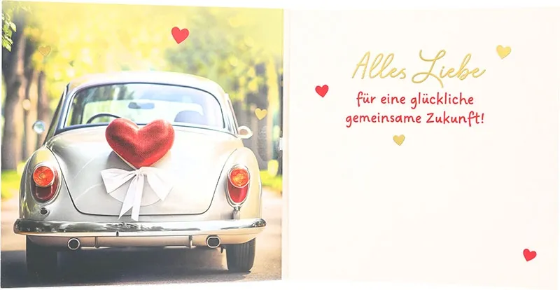 Im Inneren wird die Botschaft fortgeführt. „Alles Liebe für eine glückliche gemeinsame Zukunft!“ bringt die Wünsche klar und herzlich auf den Punkt. Gleichzeitig bleibt genügend Platz für Ihre eigenen Worte. So können Sie Ihre Glückwünsche persönlich formulieren. Kurz. Emotional. Und ganz individuell.