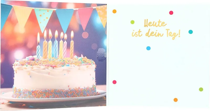 Im Inneren setzt sich das farbenfrohe Motiv fort, sodass ein stimmiges Gesamtbild entsteht. Auf der rechten Seite steht die Botschaft „Heute ist dein Tag!“. Diese wirkt motivierend und herzlich, während sie gleichzeitig Platz für Ihre eigenen Worte lässt. So können Sie Ihre Glückwünsche individuell gestalten und noch mehr Persönlichkeit einbringen.