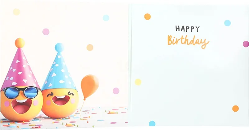 Im Inneren setzt sich das farbenfrohe Design fort, jedoch bewusst reduziert, sodass Ihre persönlichen Worte genügend Raum bekommen. Die Botschaft „Happy Birthday“ ergänzt Ihre Wünsche ideal, während sie gleichzeitig genügend Platz für individuelle Grüße lässt. So können Sie Ihre Glückwünsche ganz persönlich formulieren und dennoch die fröhliche Grundstimmung beibehalten.