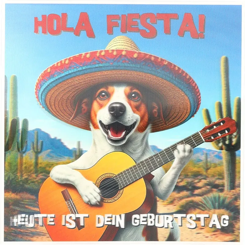 Ein Geburtstag darf bunt sein, und gleichzeitig darf er voller Energie stecken, denn genau dafür ist diese Karte gemacht. Die 3D Musikkarte “Hola Fiesta!” bringt sofort gute Laune, weil sie Farbe, Humor und Musik miteinander verbindet, während sie gleichzeitig ein echtes Highlight darstellt. Sie wirkt lebendig, und sie versprüht Lebensfreude, sodass Ihre Glückwünsche sofort begeistern.