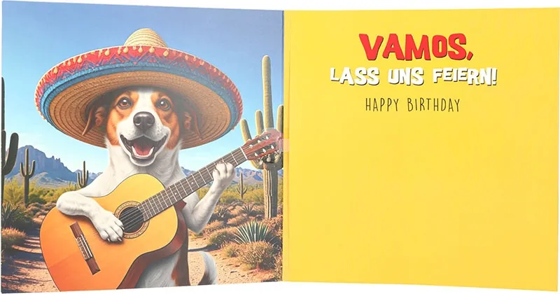 Im Inneren setzt sich das farbenfrohe Motiv fort, sodass ein stimmiges Gesamtbild entsteht. Auf der rechten Seite lesen Sie „Vamos, lass uns feiern! Happy Birthday“. Diese Botschaft wirkt mitreißend und herzlich, während sie gleichzeitig Raum für Ihre eigenen Worte lässt. So können Sie Ihre Glückwünsche individuell gestalten und noch persönlicher machen.