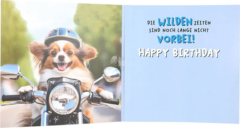 Schon das Cover begeistert mit einem charmanten Motiv. Ein fröhlicher Hund sitzt auf einem Motorrad. Er trägt einen Helm. Und er strahlt pure Lebensfreude aus. Die Farben sind hell. Die Szene wirkt dynamisch. Gleichzeitig vermittelt der Spruch „Mit Vollgas ins neue Lebensjahr!“ eine klare Botschaft. Es geht nach vorne. Es geht mit Energie weiter. Und genau das macht diese Karte so besonders.