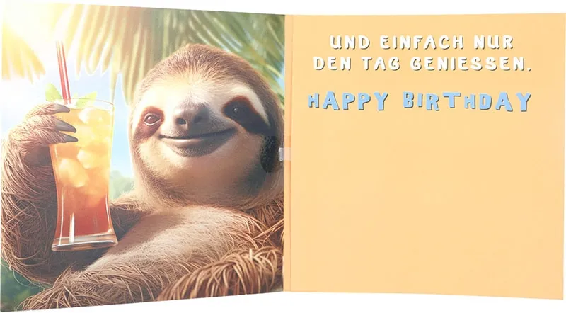 Schon das Cover lädt zum Schmunzeln ein. Ein entspanntes Faultier lehnt sich gemütlich zurück. In der Hand hält es ein erfrischendes Getränk. Die Szene wirkt sommerlich. Die Farben sind warm. Und das Motiv strahlt pure Gelassenheit aus. Gleichzeitig bringt der Spruch den „Tagesplan“ humorvoll auf den Punkt. Weniger Stress. Mehr Genuss. Genau das wünscht man sich doch zum Geburtstag.