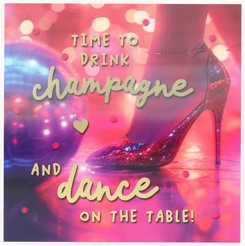 Bereits das Cover zieht alle Blicke auf sich. Ein funkelnder High Heel in intensiven Pink- und Violetttönen steht im Mittelpunkt. Umgeben von schimmernden Lichtern, glänzenden Kugeln und einer glamourösen Party-Atmosphäre wirkt das Motiv lebendig und aufregend. Der Schriftzug „Time to drink champagne and dance on the table!“ vermittelt sofort die Botschaft: Heute wird gefeiert – und zwar richtig.