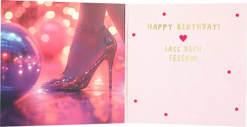 Im Inneren erwartet Sie ein stilvoll reduziertes Design. Der Gruß „Happy Birthday! Lass dich feiern!“ wird von kleinen, verspielten Details ergänzt. Gleichzeitig bleibt ausreichend Platz für Ihre persönlichen Worte. Und genau hier können Sie kreativ werden. Ob herzlich, humorvoll oder inspirierend – Sie entscheiden, wie Ihre Botschaft klingt.