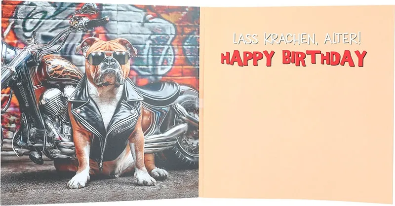 Im Inneren wird die Botschaft fortgeführt. „Lass krachen, Alter! Happy Birthday“ bringt es locker und direkt rüber. Gleichzeitig bleibt genug Platz für Ihre eigenen Worte. So können Sie Ihre Glückwünsche persönlich gestalten. Kurz. Ehrlich. Und genau passend zur Person.