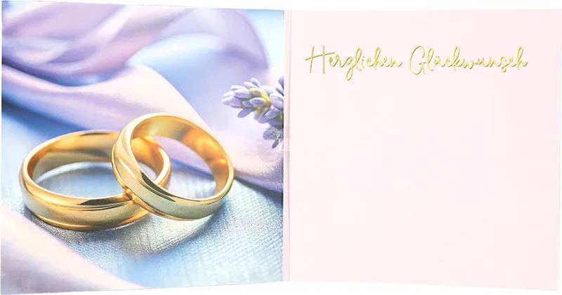 Schon das Cover zieht Sie sofort in seinen Bann. Zwei goldene Ringe liegen eng beieinander, sodass sie Verbundenheit symbolisieren. Gleichzeitig stehen sie für Liebe, Treue und Vertrauen. Der weiche Hintergrund wirkt ruhig, während zarte Stoffe und feine Farbtöne eine warme Atmosphäre schaffen. Dadurch entsteht ein harmonisches Gesamtbild, das perfekt zur Hochzeit passt. Und genau deshalb fühlt sich diese Karte so besonders an.