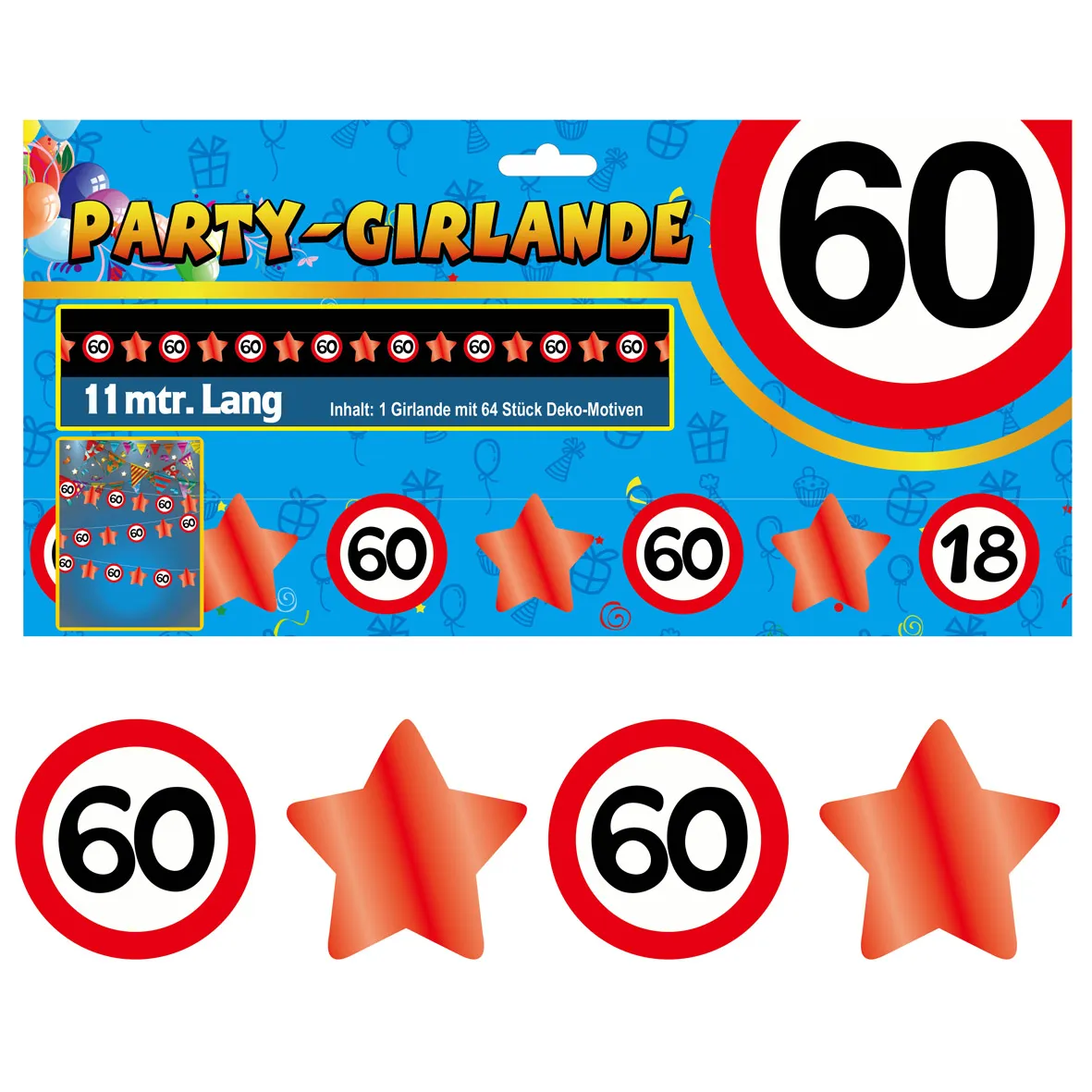 Die Motive hängen an einem stabilen Nylonfaden, sodass Sie die Girlande schnell und unkompliziert befestigen. Gleichzeitig sorgt das leichte Material dafür, dass die Girlande sanft schwingt und dadurch noch mehr Aufmerksamkeit erzeugt. Die runden Verkehrsschilder mit der „60“ wechseln sich mit dekorativen Sternen ab, sodass ein abwechslungsreiches und fröhliches Gesamtbild entsteht.