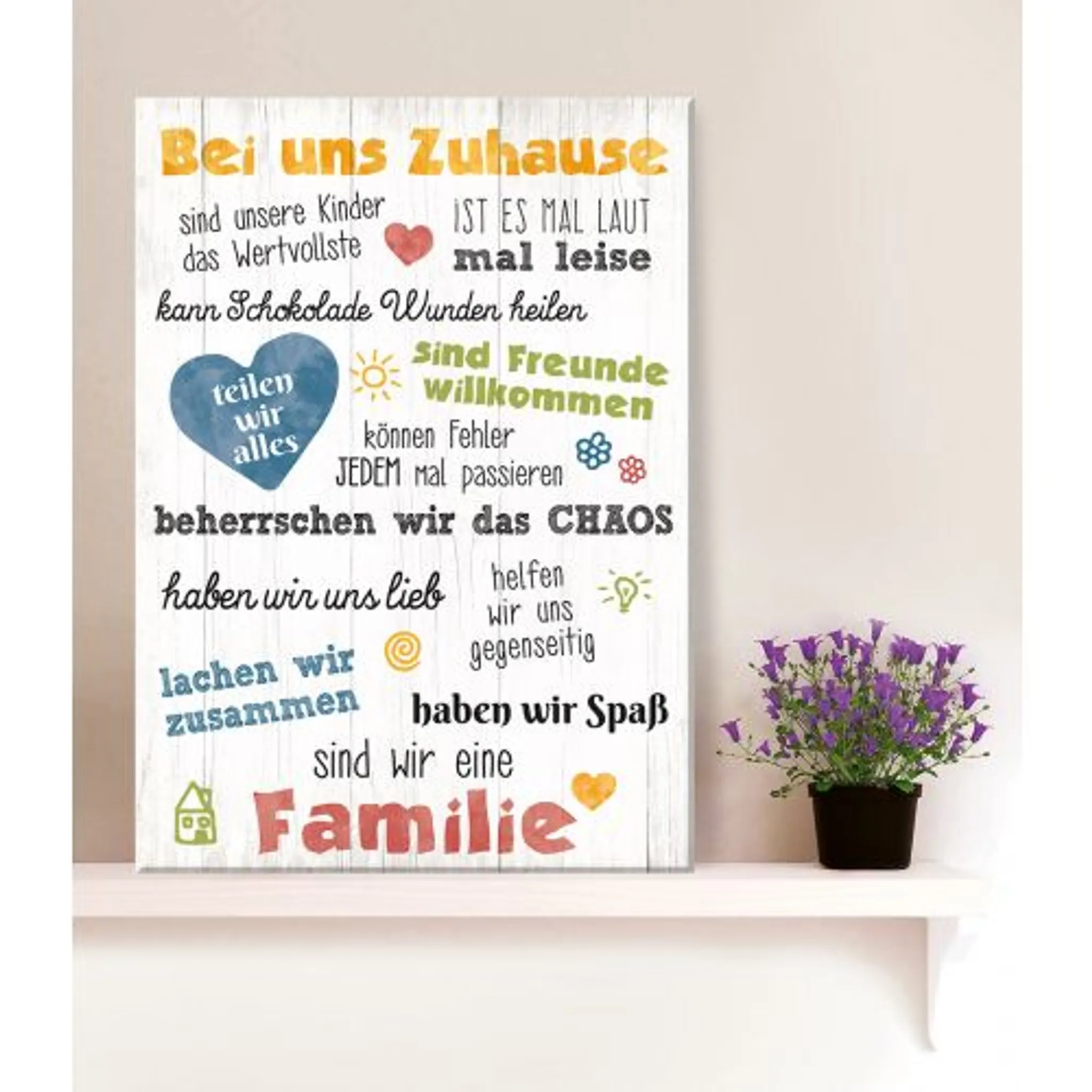 Verleihen Sie Ihrem Zuhause mit dem Bild ‘Bei uns Zuhause’ eine ganz besondere Note. Dieses stilvolle Wandbild ist nicht nur ein dekorativer Hingucker, sondern auch eine liebevolle Erinnerung an die kleinen Dinge, die das Leben besonders machen. Der charmante Aufdruck mit den Worten „…sind unsere Kinder das Wertvollste – ist es mal laut mal leise – kann Schokolade Wunden heilen – sind Freunde willkommen – usw“ schafft eine warme Atmosphäre. Es wird zu einer freundlichen und einladenden Botschaft, die Nähe, Geborgenheit und Harmonie in Ihr Zuhause bringt. Die verschiedenen Schriftarten, die auf dem Bild verwendet wurden, sorgen für einen lebendigen Eindruck und verleihen dem Bild eine moderne und dennoch zeitlose Ausstrahlung.