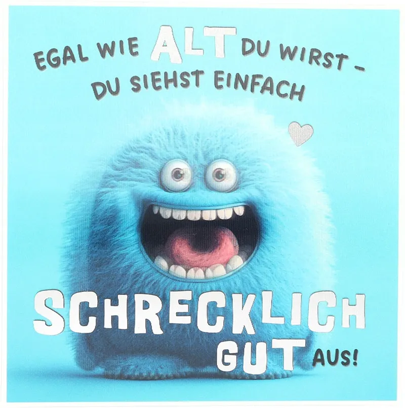 Schon das Cover sorgt für ein Lächeln, denn ein flauschiges, blaues Monster blickt mit großen Augen und einem breiten Grinsen direkt nach vorne. Dadurch entsteht eine fröhliche und leicht freche Stimmung, während der Spruch „Egal wie alt du wirst – du siehst einfach schrecklich gut aus!“ die humorvolle Botschaft perfekt transportiert. Gleichzeitig verstärken die weichen Farben und das liebevolle Design den positiven Eindruck, sodass die Karte sofort Sympathie auslöst.