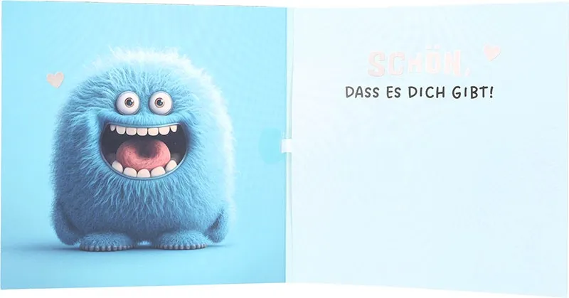 Im Inneren setzt sich das niedliche Motiv fort, sodass ein stimmiges Gesamtbild entsteht. Auf der rechten Seite lesen Sie die Botschaft „Schön, dass es dich gibt!“. Diese Worte wirken ehrlich und herzlich, während sie gleichzeitig Raum für Ihre eigenen Wünsche lassen. So können Sie Ihre Glückwünsche individuell gestalten und noch mehr Persönlichkeit einbringen.