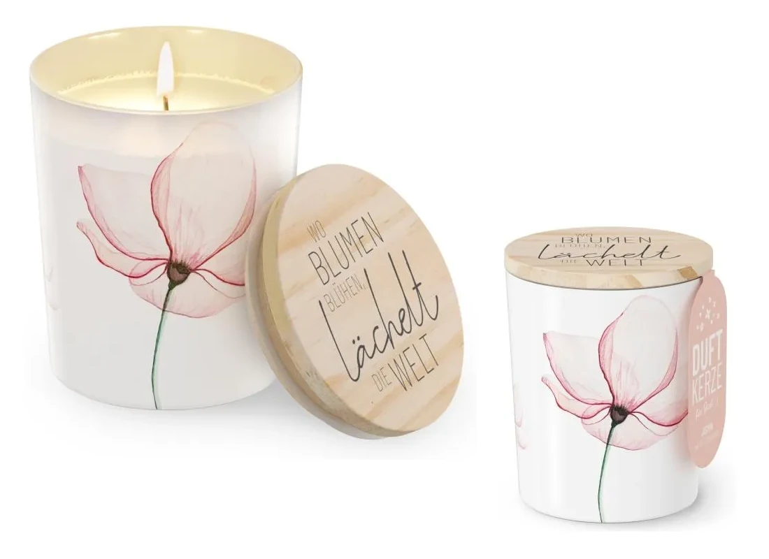 Doch nicht nur die Optik überzeugt, sondern auch die liebevollen Details. Der hochwertige Holzdeckel schützt die Kerze, während er gleichzeitig mit der Botschaft „Wo Blumen blühen, lächelt die Welt“ ein Gefühl von Leichtigkeit und Lebensfreude vermittelt. So schenken Sie nicht nur ein Produkt, sondern auch eine emotionale Botschaft, die lange nachwirkt.