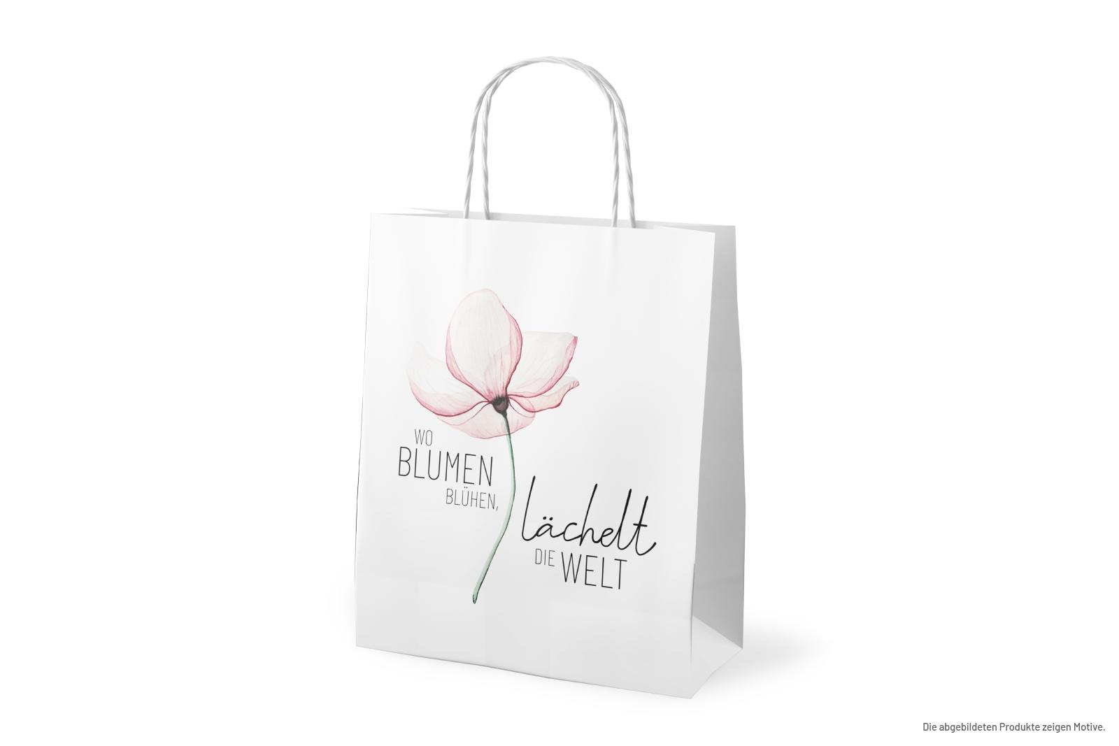 Ein schöner Schriftzug auf weißem Grund “Wo Blumen blühen lächelt die Welt” und eine schöner rosafarbene Blüte vervollständigen diese wunderschöne Geschenktüte.