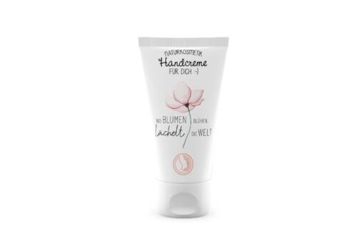 In der schönen Tube mit dem Schriftzug “Wo Blumen blühen lächelt die Welt”, befindet sich eine pflegende Handcreme mit Bio-Sheabutter für ein besonderes Hautgefühl.