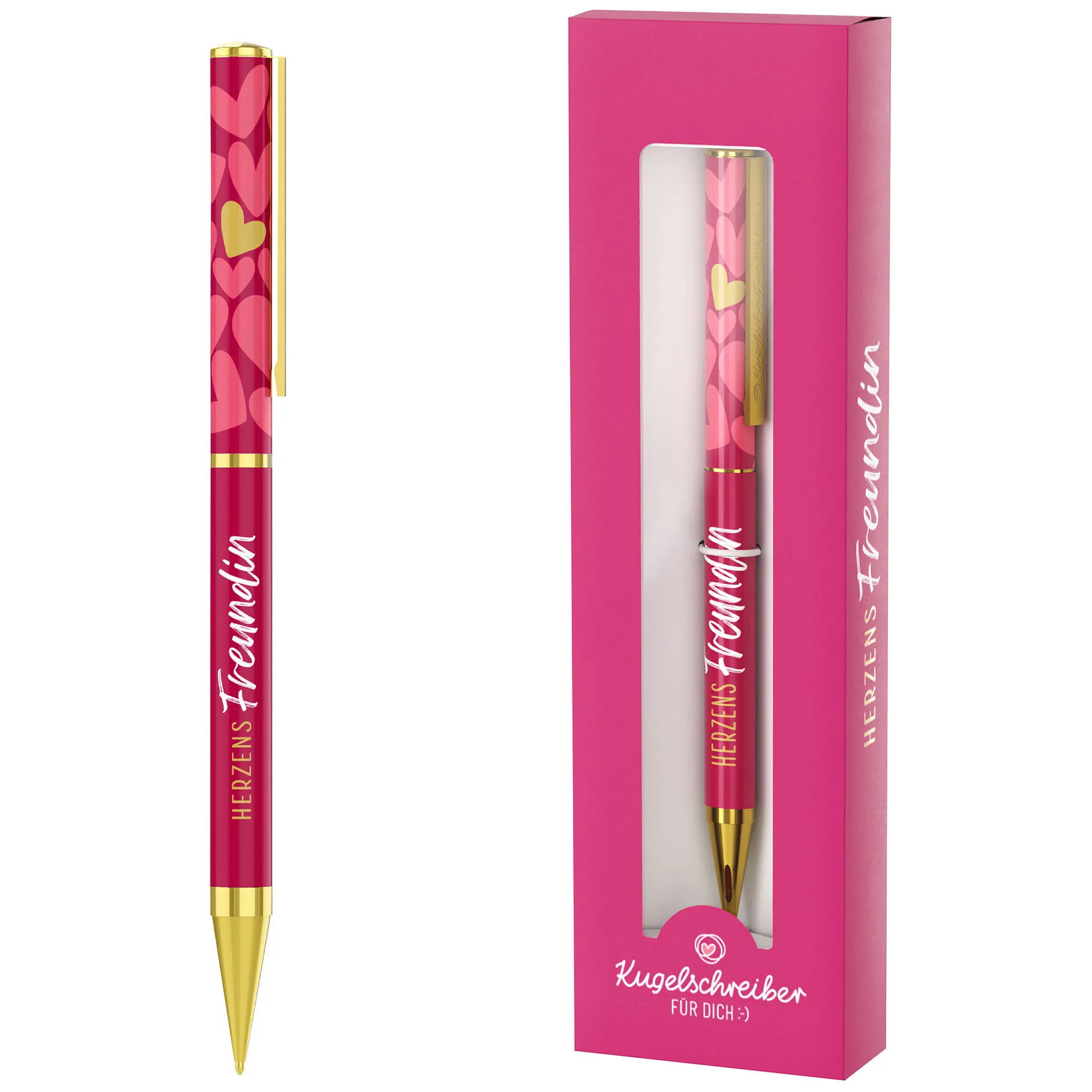 Das kräftige Pink wirkt lebendig und warm, während die goldenen Details für eine edle Note sorgen. Gleichzeitig ziehen die liebevoll gestalteten Herzmotive sofort die Aufmerksamkeit auf sich, weil sie Nähe und Verbundenheit symbolisieren. Der Schriftzug „Herzensfreundin“ macht den Stift zu etwas ganz Persönlichem, und genau dadurch wird er zu einem kleinen Zeichen echter Freundschaft.