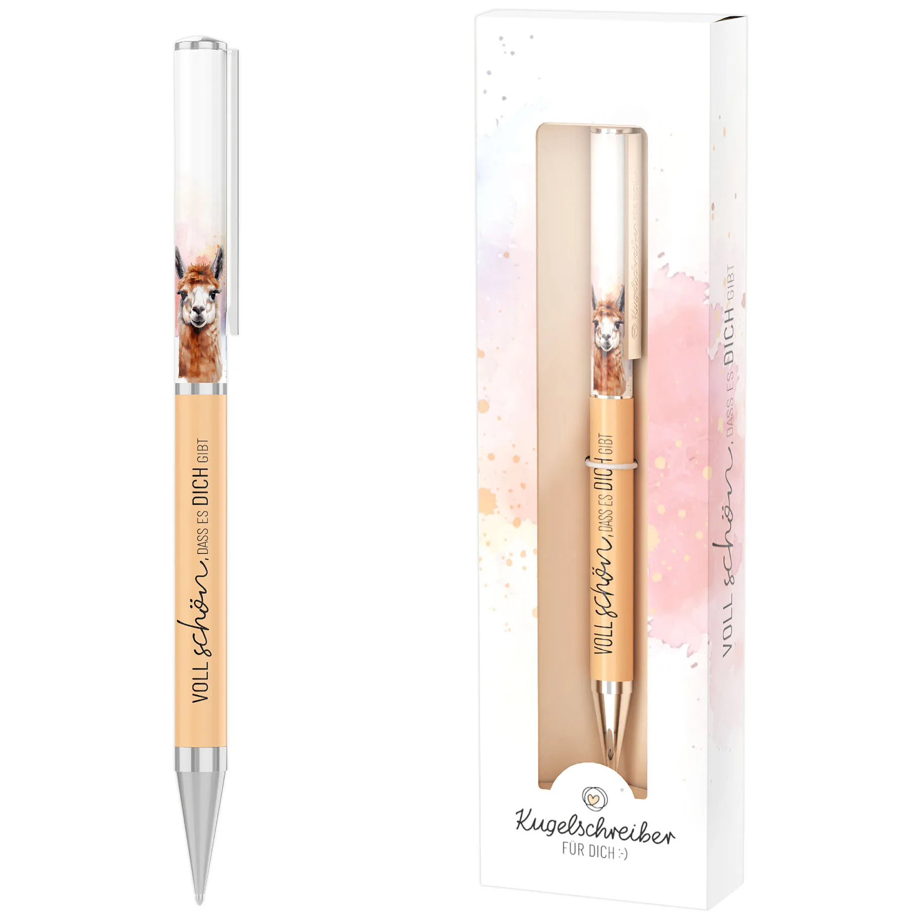 Das liebevoll gestaltete Lama-Motiv wirkt ruhig und freundlich, sodass es sofort ein Lächeln hervorruft. Gleichzeitig verleihen die sanften Farbverläufe in warmem Apricot und zarten Pastelltönen dem Design eine moderne und harmonische Ausstrahlung. Und weil die feinen Farbsprenkel das Motiv umspielen, wirkt der Stift lebendig und besonders.