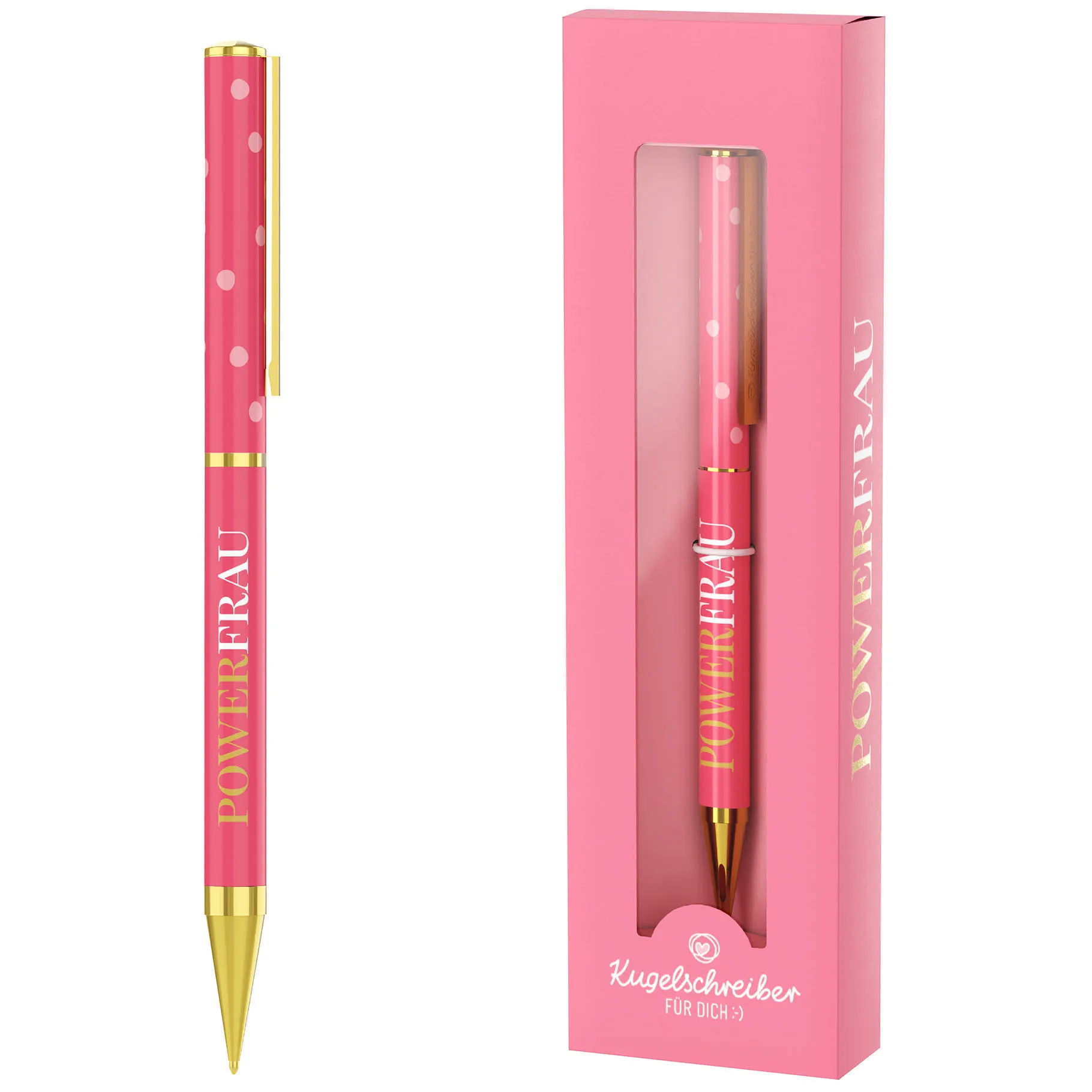 Das kräftige Pink fällt sofort auf, weil es Energie und Selbstbewusstsein ausstrahlt. Gleichzeitig setzen die goldenen Elemente elegante Akzente, sodass ein harmonisches und hochwertiges Gesamtbild entsteht. Die feinen Punkte verleihen dem Design eine verspielte Note, während der Schriftzug „Powerfrau“ eine klare Botschaft transportiert. So wird aus einem Schreibgerät ein echtes Statement.