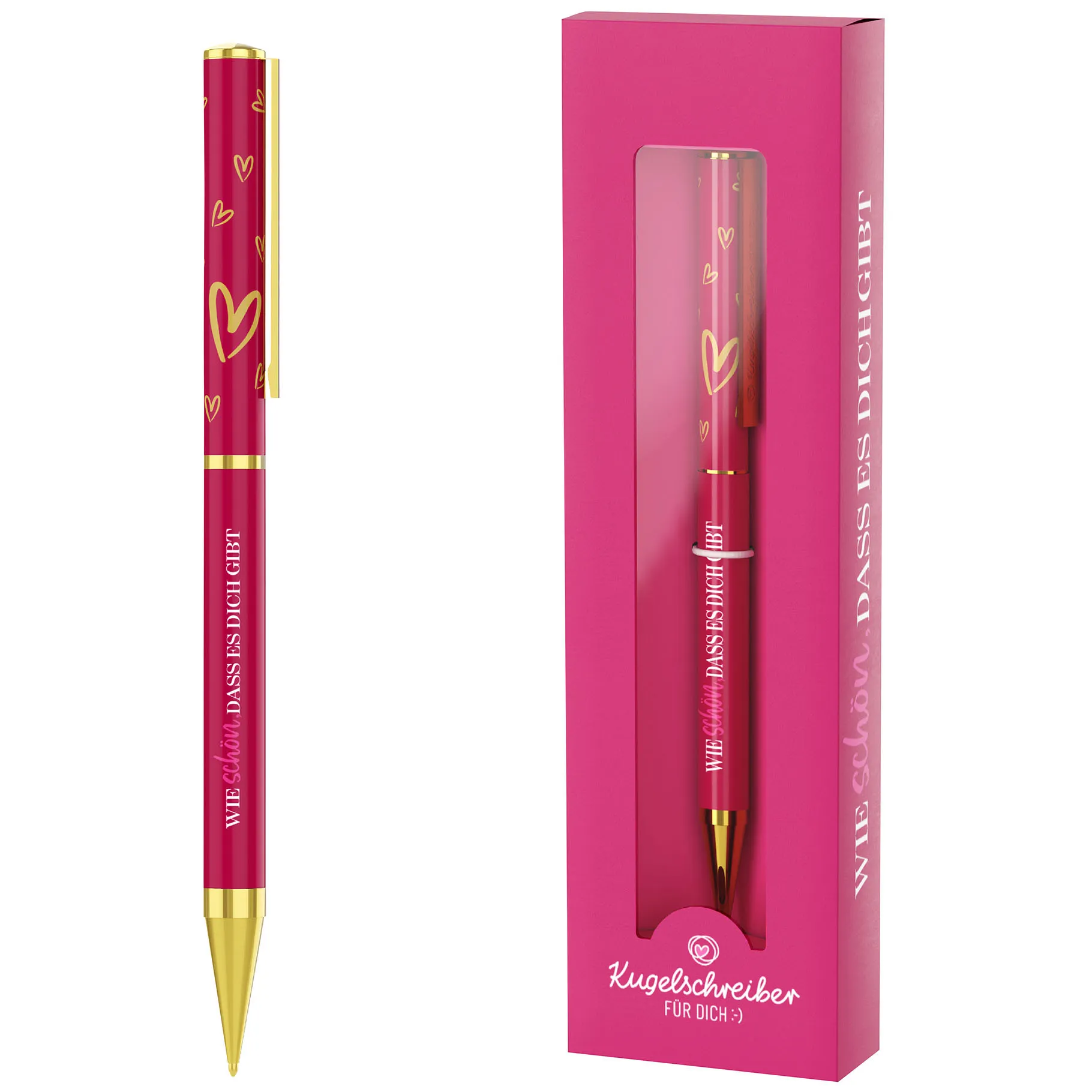 Das intensive Pink wirkt lebendig, während die goldenen Details für Eleganz sorgen. Gleichzeitig ziehen die feinen Herzmotive sofort die Blicke auf sich, weil sie Leichtigkeit und Wärme ausstrahlen. Und der Schriftzug „Wie schön, dass es Dich gibt“ macht den Stift zu einer liebevollen Botschaft, die jeden Tag ein kleines Lächeln schenkt.