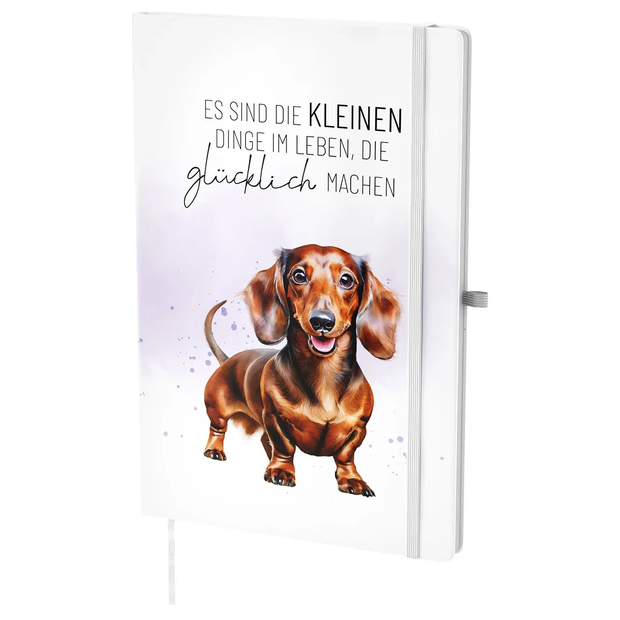 Das liebevoll gestaltete Dackelmotiv wirkt lebendig und freundlich, sodass es sofort gute Laune verbreitet. Gleichzeitig strahlt der kleine Hund Wärme und Lebensfreude aus, wodurch Sie sich direkt angesprochen fühlen. Und weil die feinen violetten Farbsprenkel das Design auflockern, wirkt das Notizbuch modern und stilvoll.