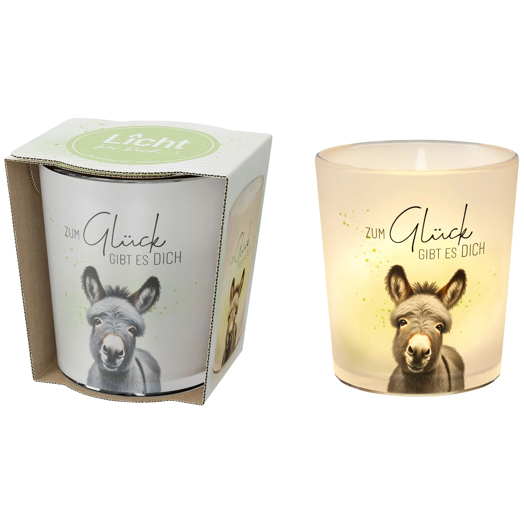 Schon beim ersten Anblick fällt das niedliche Esel-Motiv ins Auge. Es wirkt freundlich, ruhig und zugleich charmant. In Kombination mit dem Schriftzug „Zum Glück gibt es dich“ entsteht eine besondere Wirkung, die Wärme und Wertschätzung vermittelt. So wird dieses Windlicht zu einem dekorativen Highlight, das gleichzeitig Emotionen transportiert.