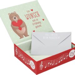 Die Geschenkbox bietet im Inneren Raum für einen kleinen Umschlag, in dem Sie liebevolle Botschaften, Kleingeld oder einen Gutschein deponieren können. Zusätzlich bleibt genügend Platz für ein kleines Geschenk, das die Überraschung perfekt abrundet.
