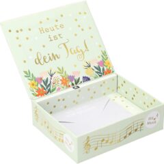Die äußere Gestaltung der Soundbox ist ebenso charmant wie der Inhalt. Ein fröhlicher Blumenstrauß ziert die Oberfläche und verleiht der Schachtel eine fröhliche Ausstrahlung. Der Spruch Herzlichen Glückwunsch” rundet das Design ab und lässt die Box zu einem echten Blickfang werden. Auch im Inneren des Deckels finden Sie die passende Aufschrift: “Heute ist dein Tag” – eine Einladung, die mit einem Augenzwinkern zum Feiern und Genießen animiert.