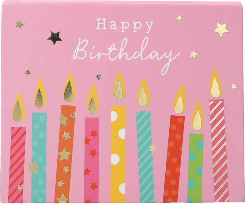 Äußerlich ziert die rosafarbene Soundbox viele bunte Kerzen, sowie der Text: “Happy Birthday”.