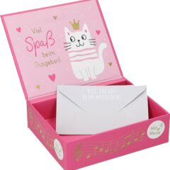 Äußerlich ziert die Soundbox eine weiße Katze mit Krone, sowie der Spruch „Queen of the Day – Happy Birthday” Passend dazu steht auf der Innenseite des Deckels “Viel Spaß beim Ausgeben“.