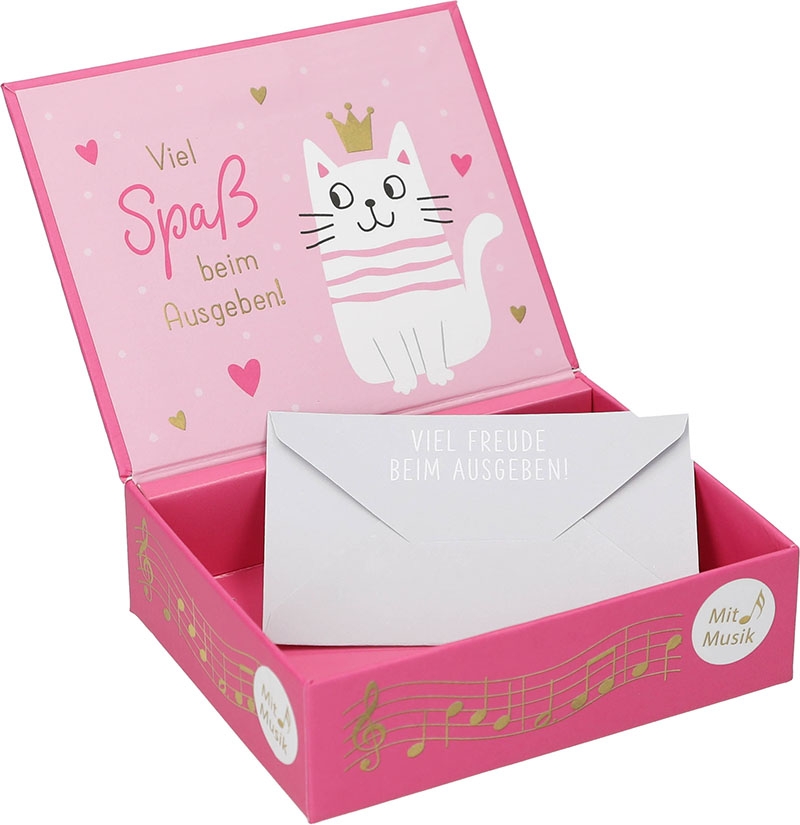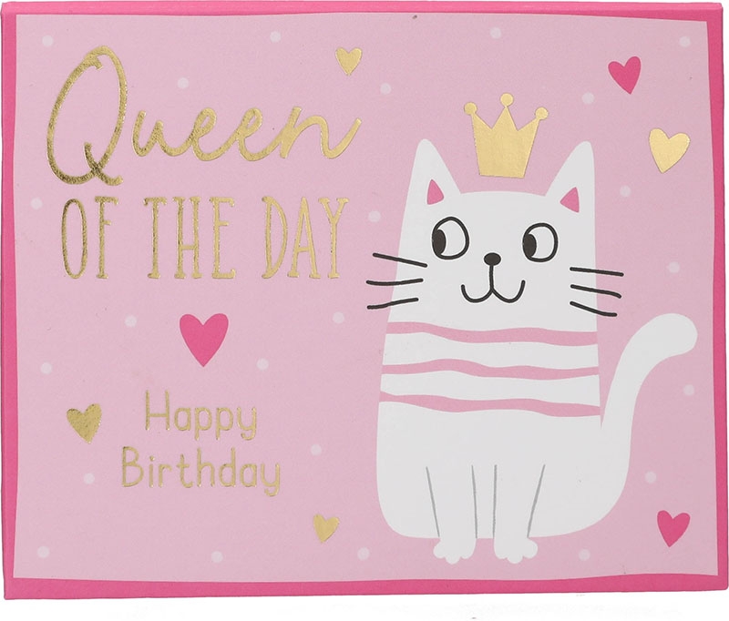 Äußerlich ziert die Soundbox eine weiße Katze mit Krone, sowie der Spruch „Queen of the Day – Happy Birthday” Passend dazu steht auf der Innenseite des Deckels “Viel Spaß beim Ausgeben“.