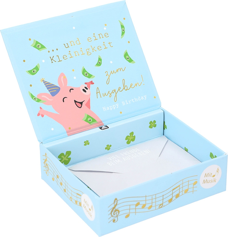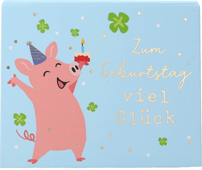 Äußerlich ziert die Soundbox ein feierndes Schwein mit Geburtstagskerze und viele Kleeblätter. Dazu der Text: „Zum Geburtstag viel Glück”. Passend dazu steht auf der Innenseite des Deckels “… und eine Kleinigkeit zum Ausgeben.“.
