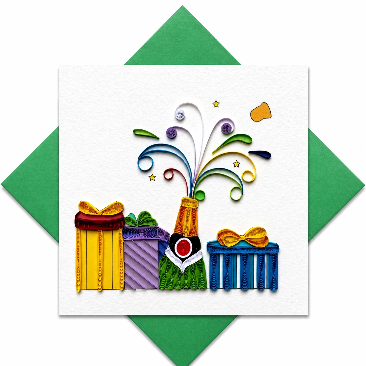 Im Zentrum sehen Sie eine elegante Champagnerflasche, und aus ihr steigen farbenfrohe Papierbögen wie sprudelnde Funken nach oben. Gleichzeitig rahmen liebevoll gestaltete Geschenke das Motiv ein. Kräftiges Gelb, tiefes Blau, frisches Grün und warmes Violett sorgen für Dynamik. Kleine Sterne ergänzen die Szene, und sie verleihen dem Design Leichtigkeit und Bewegung. So entsteht ein harmonisches Gesamtbild, das sofort gute Laune auslöst.