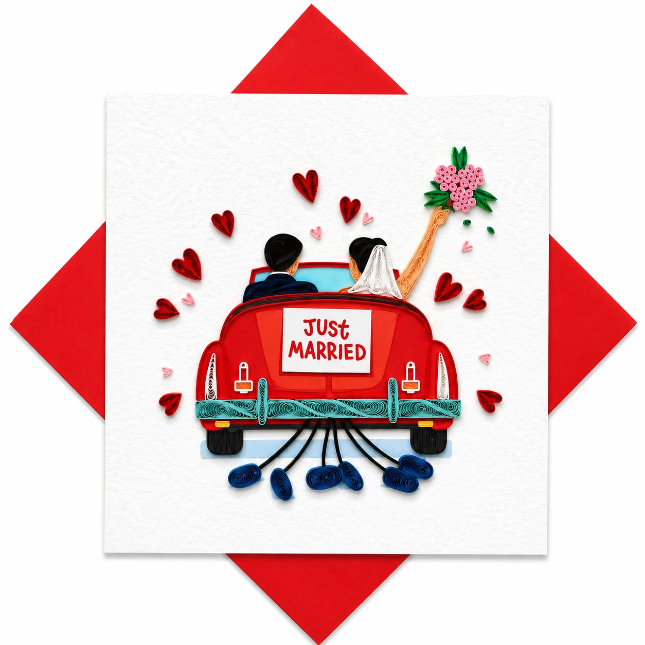 Feiern Sie den schönsten Moment zweier Menschen mit Stil und Gefühl, denn diese Karte erzählt eine echte Liebesgeschichte. Die Handgefertigte Grußkarte „Just Married“ bringt Freude, Wärme und Romantik direkt in die Hände des Brautpaares. Sie sehen ein charmantes rotes Hochzeitsauto, und darin sitzt das frisch vermählte Paar. Die Braut hebt den Blumenstrauß, und kleine Herzen tanzen um das Motiv. So entsteht sofort ein Gefühl von Glück, Leichtigkeit und Aufbruch.
