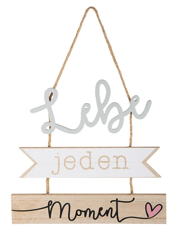Gefertigt aus MDF, überzeugt der Hänger durch seine hochwertige Verarbeitung und seine stilvolle Gestaltung. In eleganter Form und mit liebevoll aufgedruckten Sprüchen zu den Schriftzügen „Liebe das Leben” und “Lebe jeden Moment”, sorgt er für Emotionen, die bleiben.