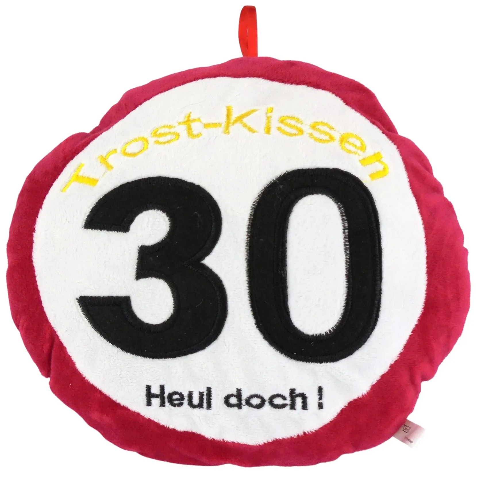 Das auffällige Design erinnert an ein klassisches Verkehrsschild, sodass die große „30“ sofort ins Auge fällt. Darüber steht „Trost-Kissen“, und darunter der augenzwinkernde Spruch „Heul doch!“. Dadurch entsteht ein humorvoller Effekt, der zum Schmunzeln einlädt und gleichzeitig die Stimmung auflockert. Die kräftigen Farben in Rot, Weiß und Schwarz sorgen zudem für eine starke Optik, während die runde Form das Kissen besonders weich und einladend wirken lässt.