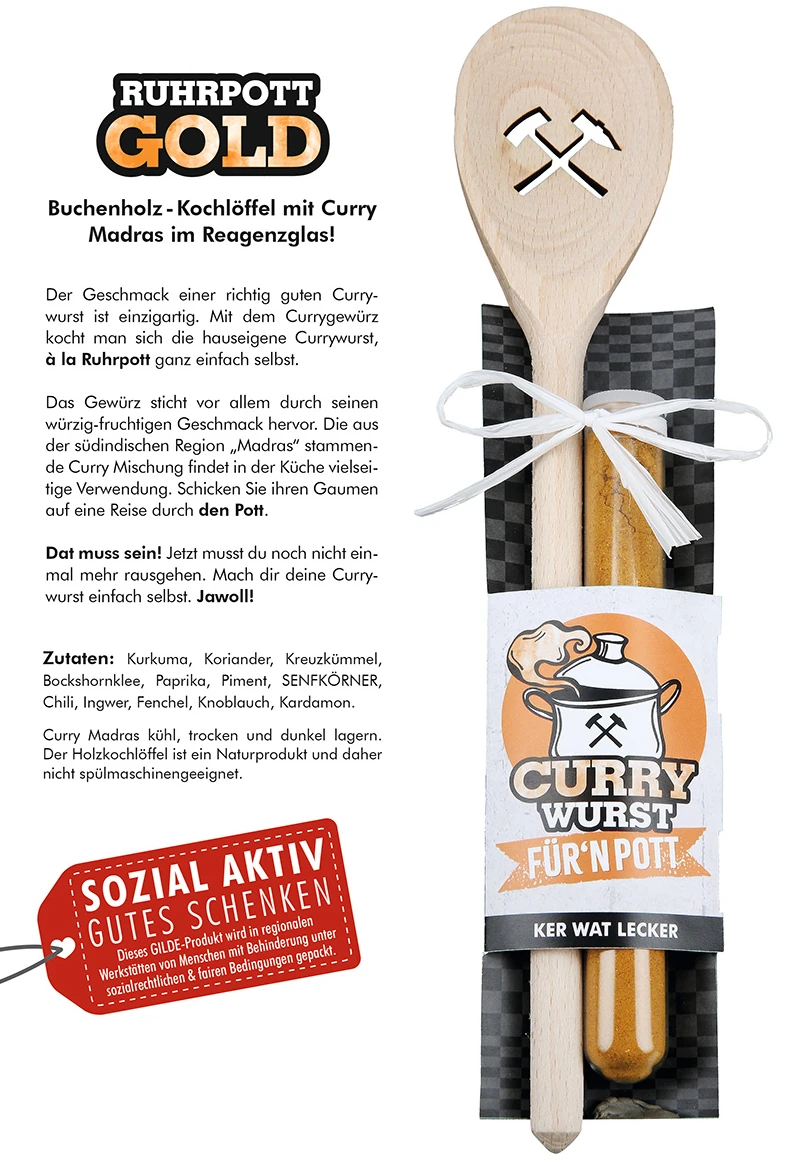 Auch optisch überzeugt das Set. Die Geschenkverpackung trägt den Spruch „Currywurst für’n Pott – Ker wat lecker“ und sorgt sofort für gute Laune. Gleichzeitig verpacken Werkstätten für Menschen mit Behinderung dieses Produkt mit viel Sorgfalt. Damit verbinden Sie Genuss mit sozialer Verantwortung.