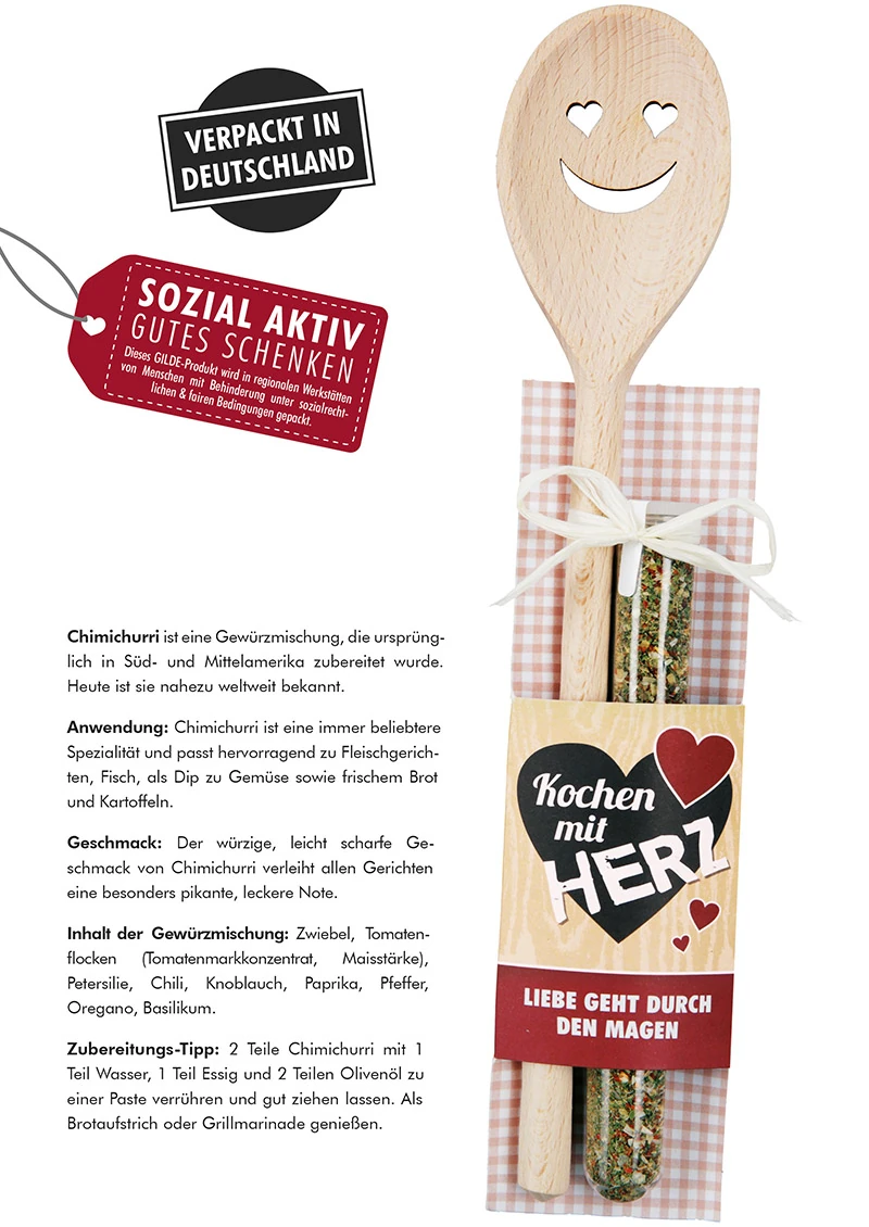 Mit dem Kochlöffel „Herz“ mit Chimichurri Gewürzmischung schenken Sie nicht nur ein praktisches Küchenutensil, sondern auch eine Botschaft, die von Herzen kommt. Denn gutes Essen entsteht dort, wo Leidenschaft, Freude und Liebe zusammenkommen. Genau dieses Gefühl transportiert dieses besondere Geschenkset – Tag für Tag und Gericht für Gericht.