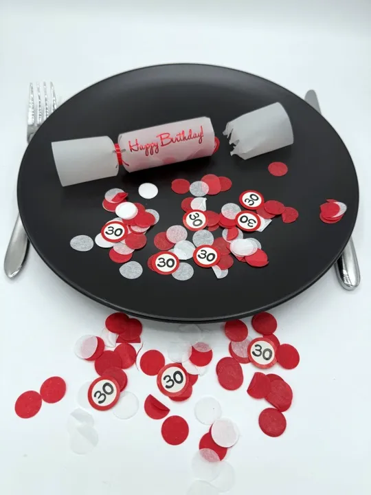 Feiern Sie den 30. Geburtstag eines geliebten Menschen mit unseren speziellen Konfetti-Bonbons! Unsere einzigartigen 6 Konfetti-Bonbons sind eine bezaubernde Art, dieses besondere Jubiläum zu würdigen und eine fröhliche Atmosphäre zu schaffen. Mit ihrer rot-glänzenden Aufschrift “Happy Birthday” und den originellen Konfetti-Schnipseln werden diese Bonbons sicherlich die Aufmerksamkeit aller Gäste auf sich ziehen. Jedes Bonbon ist kunstvoll gestaltet und zeigt das ikonische Verkehrsschild “Durchfahrt verboten!”. Mit einer eleganten und auffälligen Zahl “30” in der Mitte.