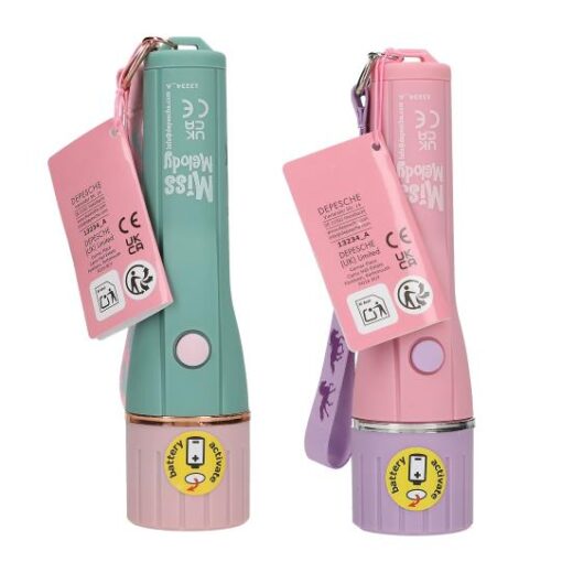 Entdecken Sie die fabelhafte Welt von Miss Melody mit unserer neuen Miss Melody Taschenlampe mit Timer! Diese Taschenlampen sind nicht nur funktional, sondern auch ein echtes Highlight für jedes kindliche Abenteuer. Mit ihrer Kombination aus Blau-Violett oder Lila-Rosa, verziert mit traumhaften Pferde-Motiven und metallischen Details, sind sie ein echter Hingucker und lassen Kinderaugen strahlen.