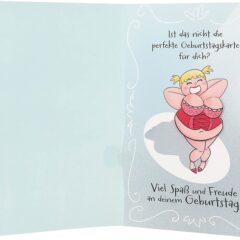 Beim Aufklappen der Karte folgt die musikalische Überraschung: Eine ganze Dame tanzt in Dessous, voller Energie und Charme. Die Szene erwacht zum Leben, sobald die Karte geöffnet wird. Die Botschaft vollendet den Gedanken der Vorderseite: “Ist das nicht die perfekte Geburtstagskarte für dich?” “Viel Spaß und Freude an deinem Geburtstag” – eine liebevolle Erinnerung daran, dass Lebensfreude keine Zahl kennt.