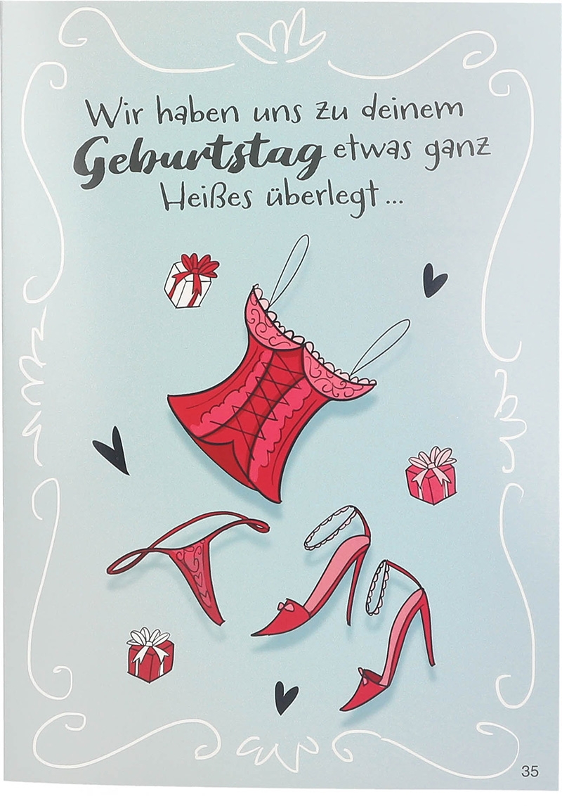 Vor einem mintfarbenen Hintergrund sieht man rote Dessous. Darüber steht augenzwinkernd der Schriftzug: „Wir haben uns zu deinem Geburtstag etwas ganz Heißes überlegt…! – ein herrlich ehrlicher Einstieg, der Lust auf mehr macht.